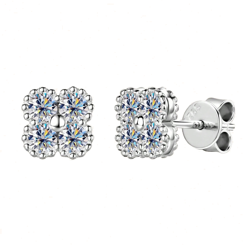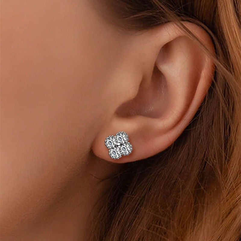Adauga un plus de stralucire si simbolism look-ului tau cu acesti cercei rafinati din argint 925, decorati cu patru diamante moissanite dispuse elegant in forma unui trifoi cu patru foi – simbol al norocului, echilibrului si elegantei. Fiecare piatra este taiata cu precizie pentru a reflecta lumina spectaculos, asemanator diamantului natural, dar cu o claritate superioara. Cerceii sunt usori, comozi la purtare si potriviti atat pentru tinute de zi, cat si pentru evenimente speciale. Un cadou ideal pentru o persoana draga sau un plus valoros in colectia ta de bijuterii.